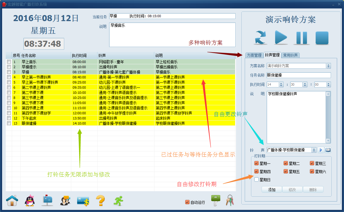 1,響鈴任務(wù)表,這里的執(zhí)行任務(wù)根據(jù)你的時(shí)間自動(dòng)執(zhí)行,已執(zhí)行完成與未執(zhí)行系統(tǒng)進(jìn)行了顏色區(qū)分。