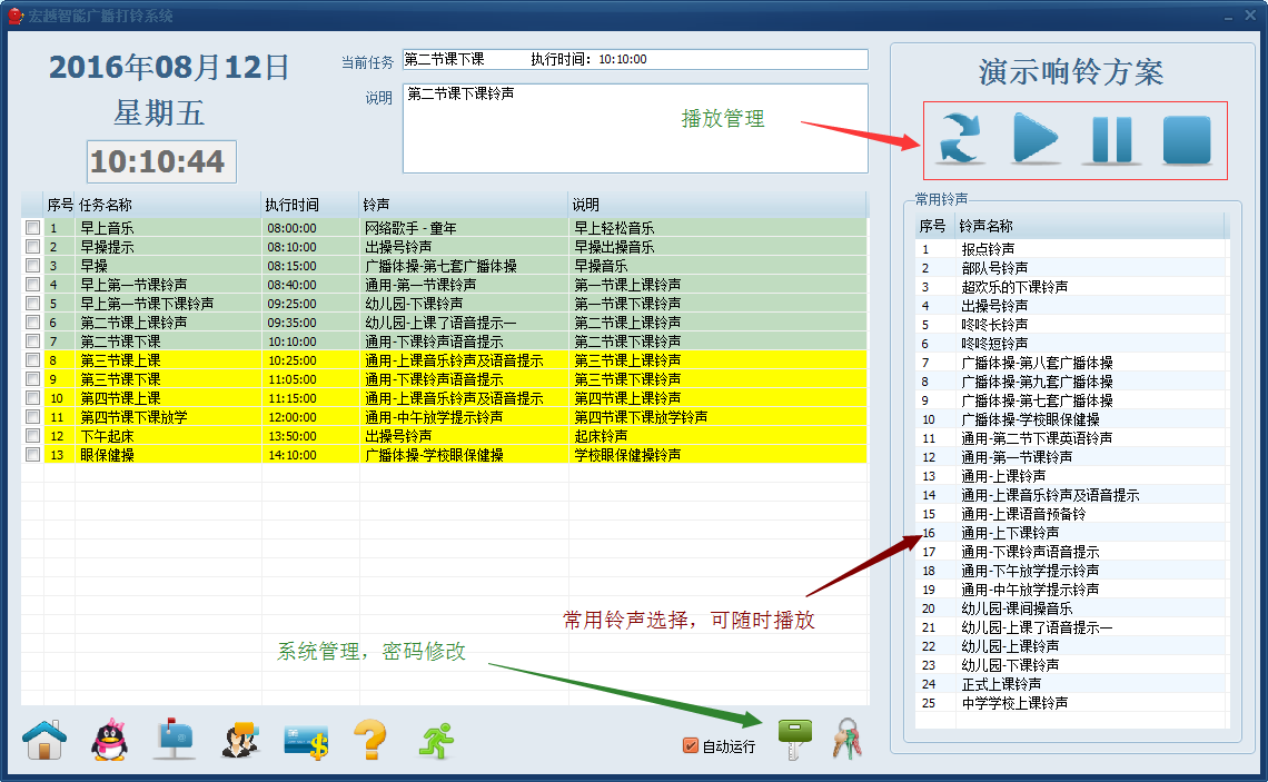 大家好,歡迎使用《宏越智能廣播打鈴系統(tǒng)》,在這里我們簡(jiǎn)單講解一下本軟件的主要功能。