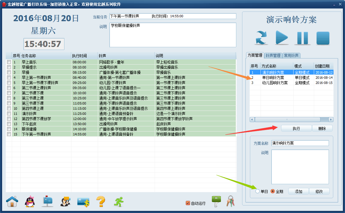 1,響鈴任務(wù)表,這里的執(zhí)行任務(wù)根據(jù)你的時(shí)間自動(dòng)執(zhí)行,已執(zhí)行完成與未執(zhí)行系統(tǒng)進(jìn)行了顏色區(qū)分。