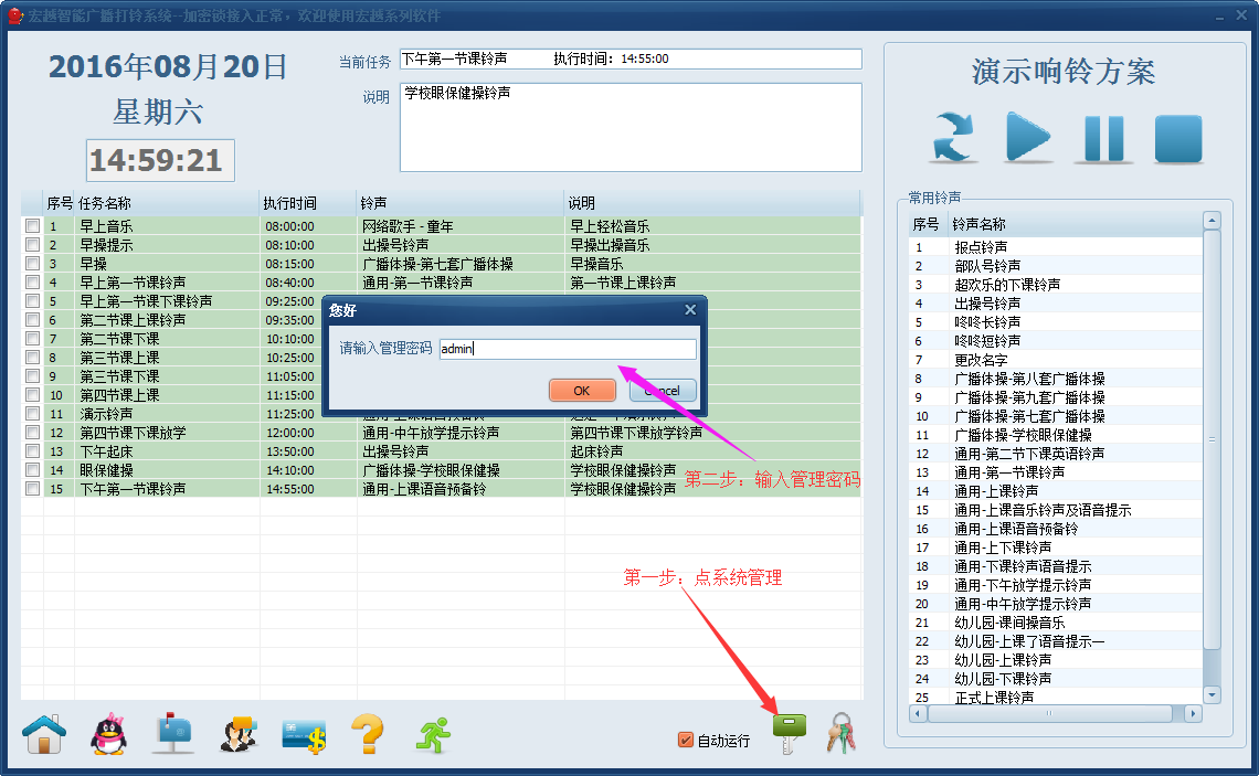 方案的主要用途是系統(tǒng)所執(zhí)行的方案管理,每個(gè)方案包括不同的響鈴任務(wù)及模式,我們點(diǎn)《系統(tǒng)管理》,輸入管理密碼《admin》,如下圖: